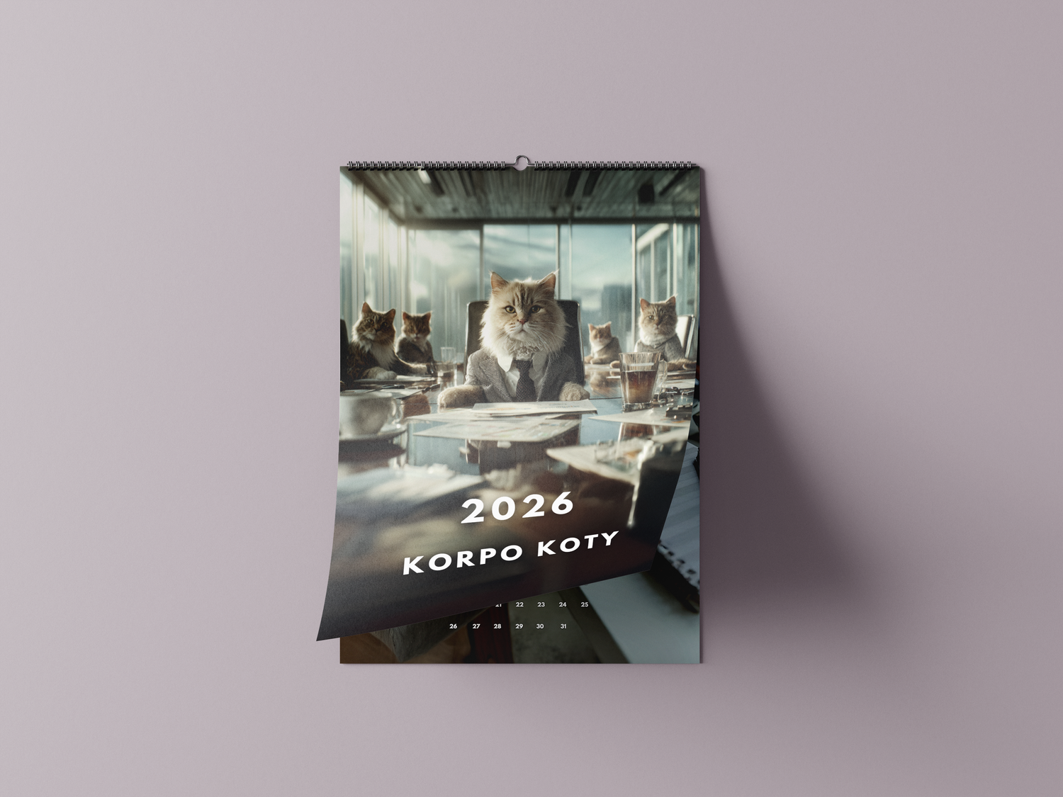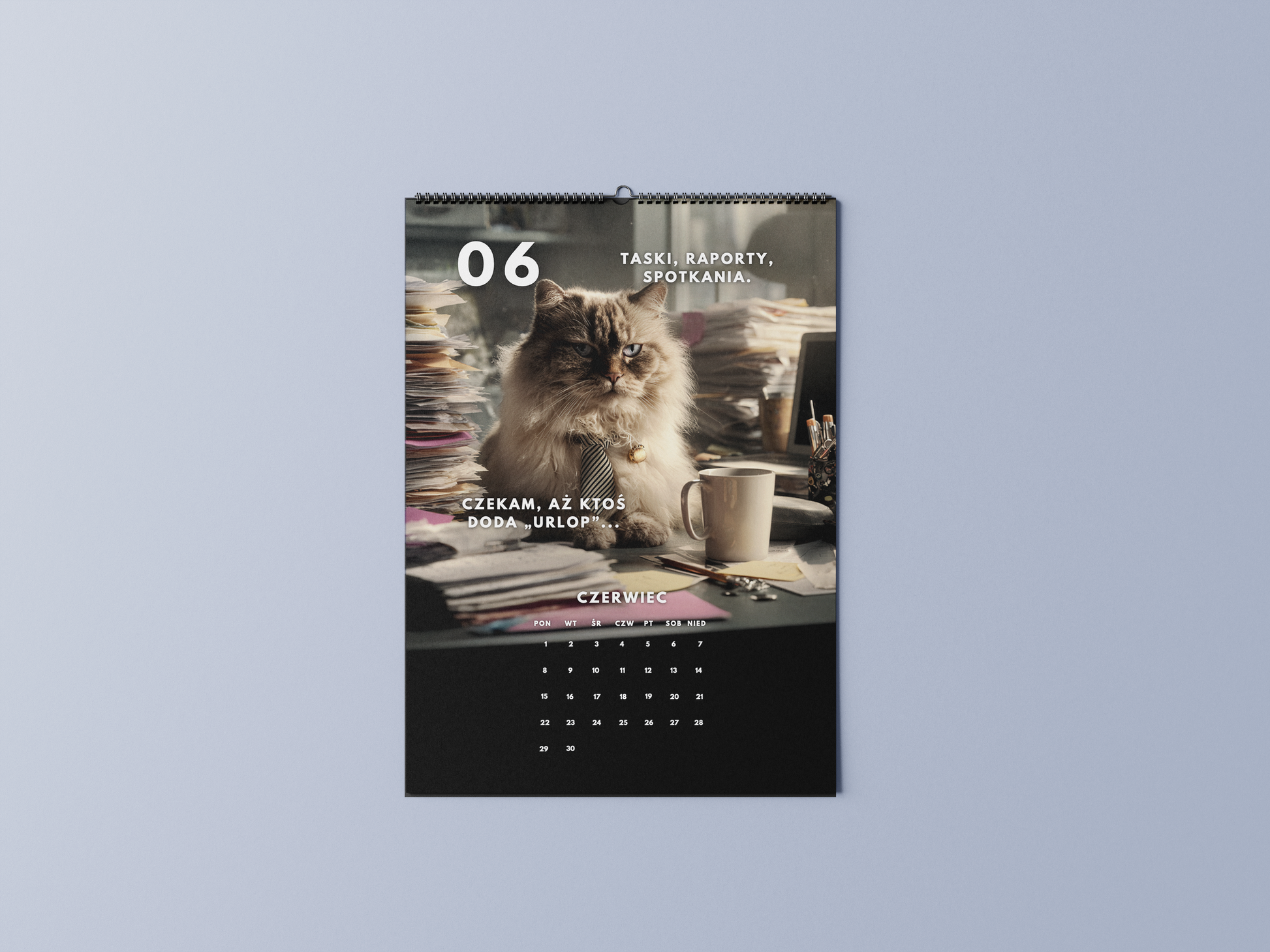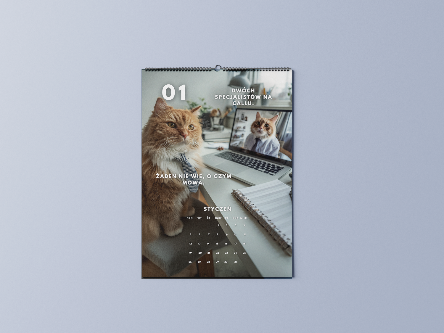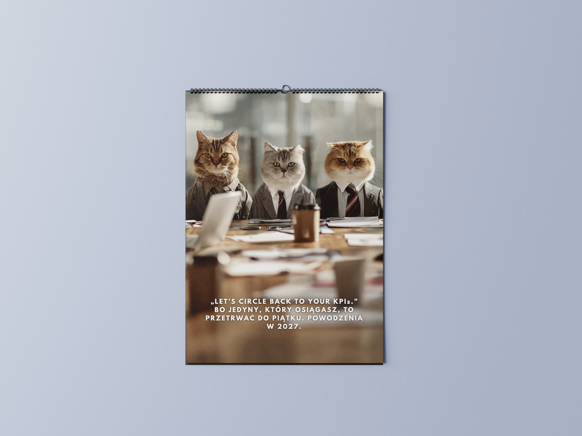 Ten kalendarz jest dla wszystkich, którzy widzieli w mailu „wrócę z odpowiedzią” i już wtedy wiedzieli, że odpowiedzi nie będzie. Każdy miesiąc pokazuje kota w typowo korporacyjnym nastroju: z kawą i minimalną wolą życia. To kalendarz, który przypomina, że praca może być "na serio", ale my nie musimy. Sprawdzi się w biurze, domowym home office albo tam, gdzie potrzebny jest codzienny, szybki reset nastroju. Kalendarz ma czytelny układ, więc jest zabawny i praktyczny jednocześnie. To idealny prezent dla twojego work bestie, współpracownika, z którym wysyłasz memy zamiast raportów albo po prostu dla siebie, żeby wiedzieć, że nie tylko ludzie udają produktywność.
