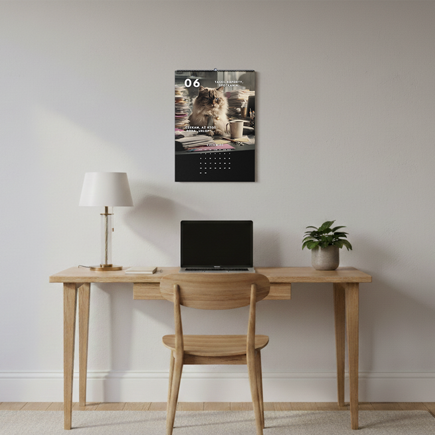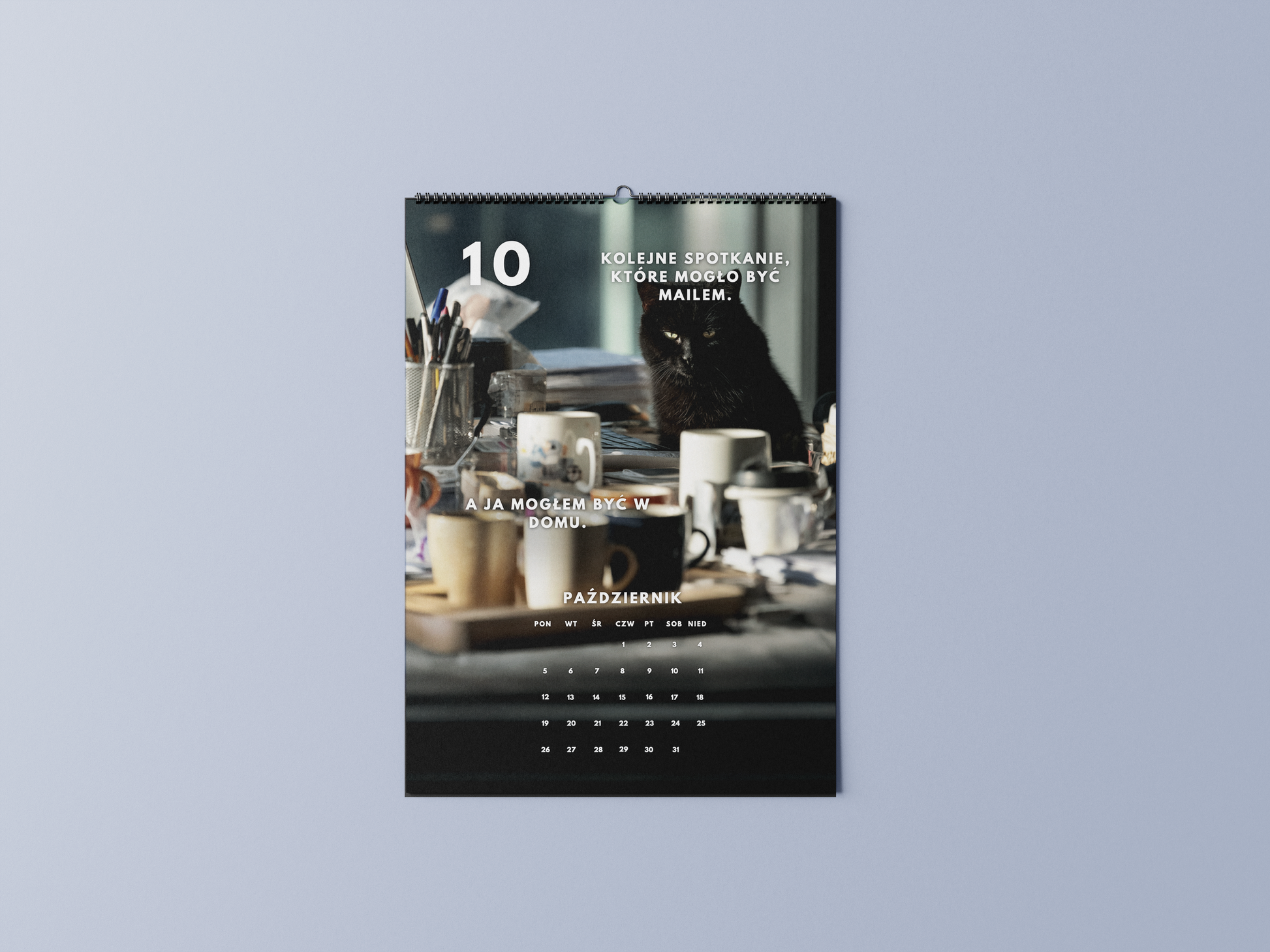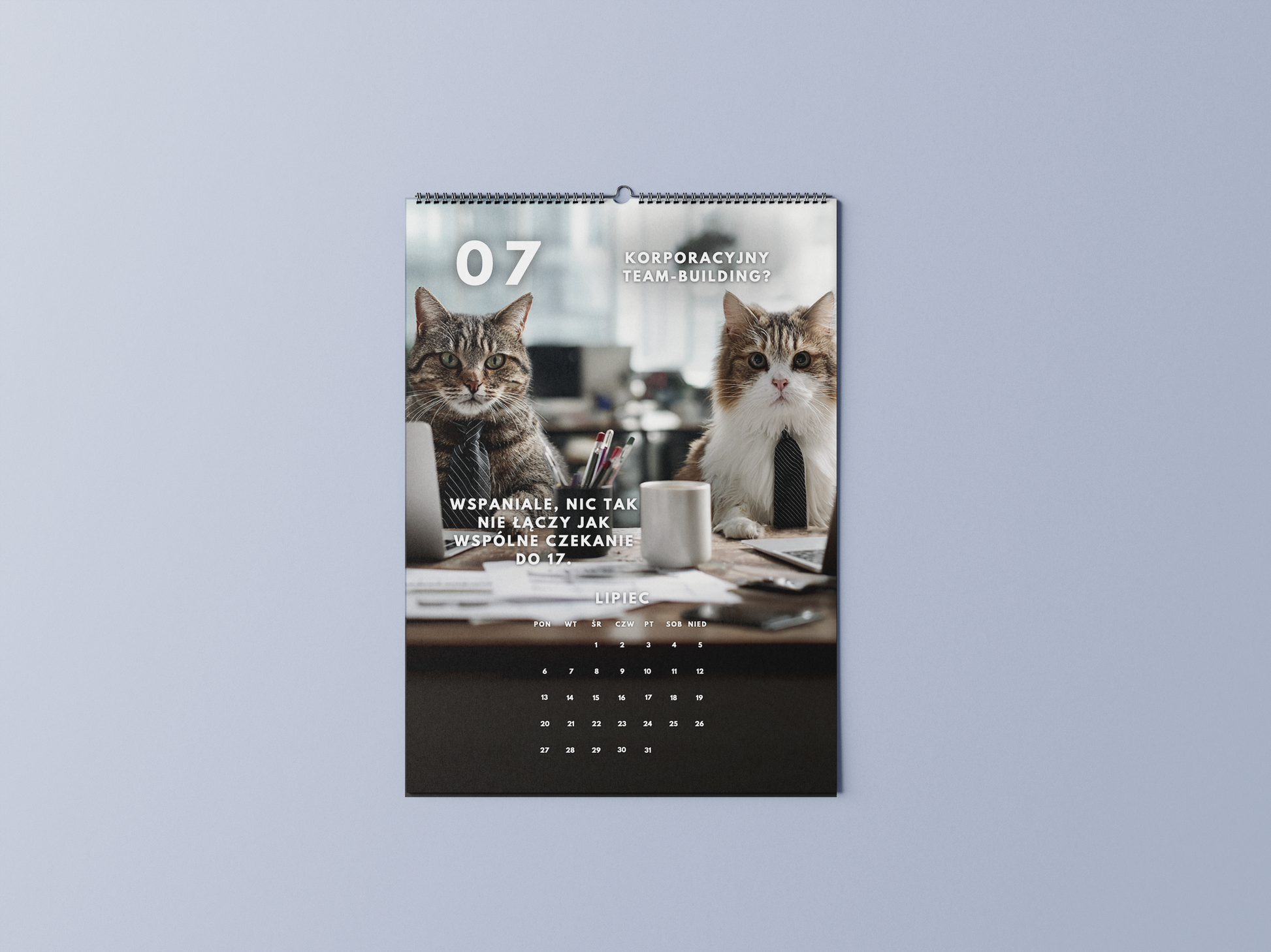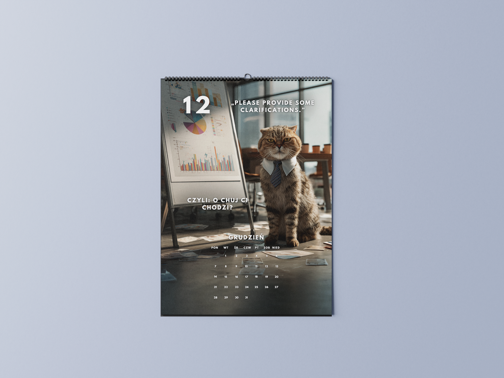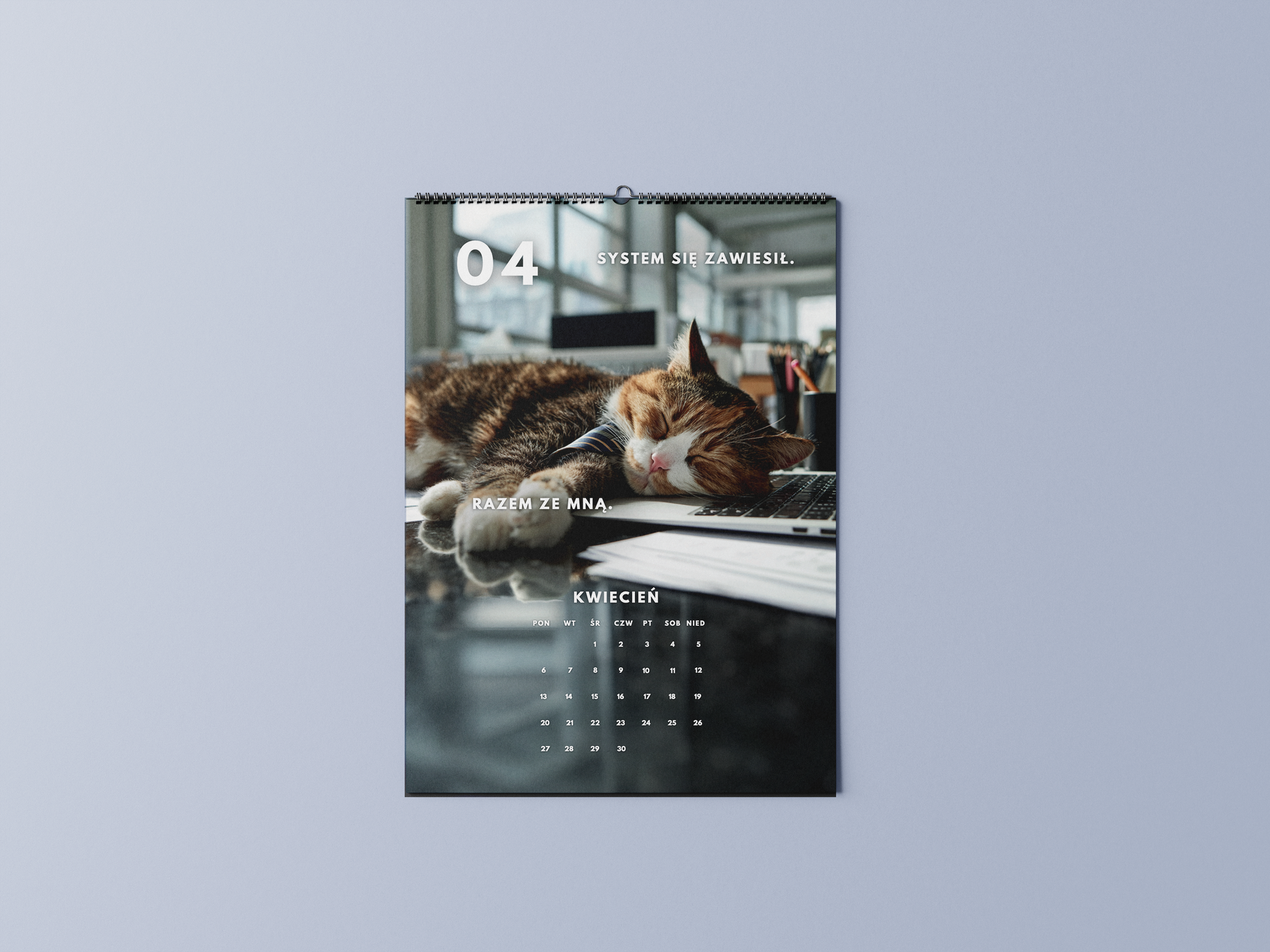 Ten kalendarz jest dla wszystkich, którzy widzieli w mailu „wrócę z odpowiedzią” i już wtedy wiedzieli, że odpowiedzi nie będzie. Każdy miesiąc pokazuje kota w typowo korporacyjnym nastroju: z kawą i minimalną wolą życia. To kalendarz, który przypomina, że praca może być "na serio", ale my nie musimy. Sprawdzi się w biurze, domowym home office albo tam, gdzie potrzebny jest codzienny, szybki reset nastroju. Kalendarz ma czytelny układ, więc jest zabawny i praktyczny jednocześnie. To idealny prezent dla twojego work bestie, współpracownika, z którym wysyłasz memy zamiast raportów albo po prostu dla siebie, żeby wiedzieć, że nie tylko ludzie udają produktywność.